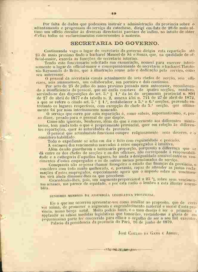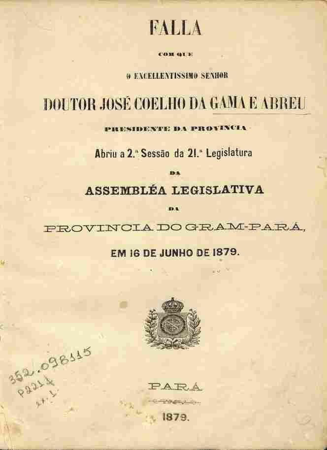Falla com que o excellentíssimo senhor doutor José Coelho da Gama e Abreu, presidente da Província, abriu a 2ª sessão da 21ª legislatura da Assembléia Legislatura da Província da Província do Gram-Pará em 16 de julho de 1879