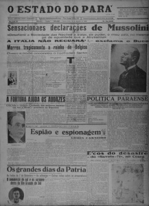 O ESTADO DO PARA. ANNO RXV NU Director - AFFONSO JUSTO CHERMONT Baixa Postal, 28 BRASIL — PARA' —BELEM — Sexta-feira, 30 de So de 1935 pes de Mussoli Morreu. tragicamente a rainha da Belgica Como e onde occorreu o luctuoso facto BRUXELLAS, 29 — Infor- mam de Lucerna;na Suissa, que a rei Leopoldo ff em rainha As- teid foram victimas de um de- aastre de automovel, nas proxi- midades daquela cidade, A rai- nha morreu em cozsequencia do desastre e o rei ficou gravemen- te ferido nos pés. (A. B.y LUCERNA, 29 — O desastre de que foi victima a rainha As- trid, da Bel gica, occor- reu da se- guirte ma- neira: Num au- tomovel via javam o rei Le op ol do a HI sua esposa a rainha Astrid. O ca ro era guia- dó pelo soberamo belga, em ves- sõa. Ao passar pela aldeia de Langwod, o vehiculo capotou, e Rainha Astrid | N Redacção, administração e oficina Campos Salles, 130 | baê, ler I caindo ao lago. A rainha foi pro- carro contra uma arvore, mor- rendo logo. O rei, porem, rece- beu apexas leves ferimentos. O corpo da mallograda sobe- rana foi transportado para a Villa Haeslihorn, wesidencia de verão dos reis da Belgica, A rainha Astrid contava arros. (A. RIO, 29-Reunio hoje a Ca- mara, sob a presidencia do sr. Euvaldo Lodi e com a presença de 94 deputados. A acta foi approvada, depois falar o sr. Matta Machado. Após a leitura do expediente, o pesidente declarou achar-se sobre a mêsa um requerimento ado por mais de 50 depu- tados, pedindo um voto de pesar pelo fallecimento da rainha da Belgica. Depois de falar o sr. Diniz Junior, encaminhandy a o> Q de assig votação, ofrequerimento foi ap-| “ yvado e em seguida levantada a sessão. (A. B.) rk , o! ds jectada violentamente fóra d |] Justa promoção & LONDRES, 29 — decididas sacções contra a Ita- lia em Gemtebra o nosso paiz dei- xará immediatamente a Socie- dade das Nações e ter-se-á, en- tão, de comprehender que quem quer que deseje applicar sanc- ções contra a Italia encontrará a hostilidade do seu exercicio e 4 ' » governador do Sá Mei. do Estado, brilhante ac e pÊ sen de relles, da Força Publ Com uma fé de par de excellente: distincto 1 des moraes, O pmpridor roso de sas funcções, pelo acontecimen to tem recebido felicitações dos collegas e amigos, seus rea O qe M nossa redacção esteve, hon- tem, o primeiro tenente Bruno Meirelles, que veio convidar O ES- TADO a se fazer rapresentar no sor. teio militar que terá logar na Esco- la Normal, domingo, ao meio diky,, Escriptor communista as portas da morte meme, MOSCOU, 29 — O Henri Barbissse, lebre escriptor communista francez, tá em estado gravissimo, havendo (A.B.) roucas esperancas de salval-o À FORTUNA AJUDA OS AUDAZES k Ei Com “todo [o conforto e;animado das elino se esperan- ças, vae a' Minas o presidente da Republica . e e o e e Dr. Getulio Vargas RIO, 29-—Hoje, ás 8,30 da noi to, o dr. Gêtulio Vargas parti em trem especial para Bello Ho, rizonte acompanhado de nume- rosa-comitiva, da qual faz parte o 9º. Antonio Carlos. S. exe. voltará no dia 4, para presidir o banquete em honra do ministro; Vicente Rão. (A.B.) RIO, 29 — Dentre os prepa- rativos para a recepção do dr. Os grandes dias da Patric O comercio do dores do Bio na ent me e ) ara q ] | dos, é Db H T ] F , é . ( T 1 o H a, N à d R | . Rom “0. 0A" » com o resumo das obm À Has) BIS | pelo sr, Maneial Terra, ma ma exeur-) mem Tlóntico 1 a firma OH, o voira Simões e offertando 15 + Getulio Vargas em Minas des- taca-se uma surpresa que lhe prepara a commiss O dr. Getulio viajará num carro de luxo ligado á composi- ção que será occupada pela sua comitiva. Não se trata de um carro Juxuoso da Central, mas do mais bello que a estrada pos- sue e encerra uma historia cu- (E spec ial ; e guerra, precisavam se correspon. | der com os seus governos, mas a censu | ra a isso não permíttia, senão em lin guagem clara, com os paizes neutros, As transmi (tas er radio clandestino, poderiam ir em cifra, porem não tarda riam a ser decriptadas e dentro de pou co tesipo a estação radio transmissora seria localizada e o espião correria o ris co de ser preso e perder o apparelho. O unico processo, portanto,era tentar bure Jarpostal, os metos legaes da correspondencia para isso, de vigilancia sobre a nlendo-se, medidas capazes de fis dir censura. Os esp de acção, ficam org dentro do territorio gados de ões to tal que em cada região haverá um ou agente qualquer, que receberá a cor Continua 2a 44 pagina) para s- | censura riosa. Nelle ha um muito como- do assento forrado de velludo que pertesceu ao imperador dom Pedro 2.º, (A. B.) BELLO HORIZONTE, 29 — Todos os deputados estaduaes receberam do sr. Raul Sá, se- (A. B.) Espião 2 esplonadéd rondencia vinda dos paizes neutros, e o qual ss encarregará de distribuil.a pelos espiões do stistrioto. Este alguem, encar. regado desse serviço, chamasse CAIXA DE CARTA S. Geralmente é um extranh o que, me. Manto pequeno ordenado, incumbe.se de fazer a distribuição, Ent retanto, as correspondencias dos espiões fazem-se por intefvedio de um palz neutro « deste, para ns suas patrias, porem, Enguagem com» » darido conta de in forma s de guerra, não só porquo censura não as deixará tambem porque poderá ser trais a nte de: as escre oberto aquelle qu tverem escriptas em ci fr tambem não as de rá pa as informações não che hi tino. O unico jr procurar burlar a fiscalisaçã ja correspondencia, As festas de / de Setembro Rr Ag adhesões — Outras notas sobre os S Prepa ativos duzias de guaraná Bimãos e 5 duzias da (O) ESTADO DO de todo o seu povo”,—declarou 1 AI VEZ tenha! sr. Mussolini ao exviado es- chegado a op-| pecial do“Daily Mail”, sr. Ward . rico portunidade de | Price. | esclarecer que 0 “A Kalia—acerescentou o Du- ce-—não recuará. S roverno sr. Affonso Jus- ses the j y de Roma modificasse a sua at- to Chermont, directa ou in- | titude, os 200.000 fuzis italia- directamente, nunca pleiteou | nos