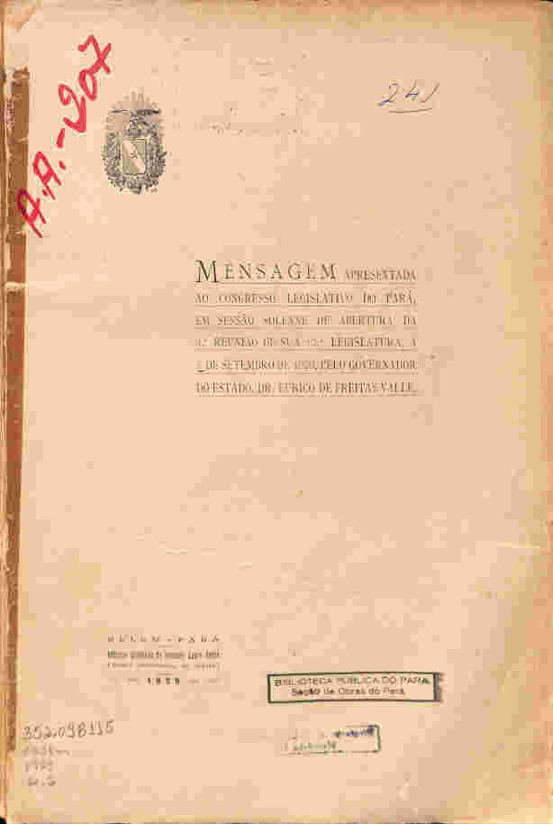 Mensagem apresentada ao congresso legislativo do Pará, em sessão solene de abertura da 3ª reuniaão de sua 13ª legislatura, a 7 de setembro de 1929, pelo governador do Estado, Dr. Eurico de Freitas Valle.