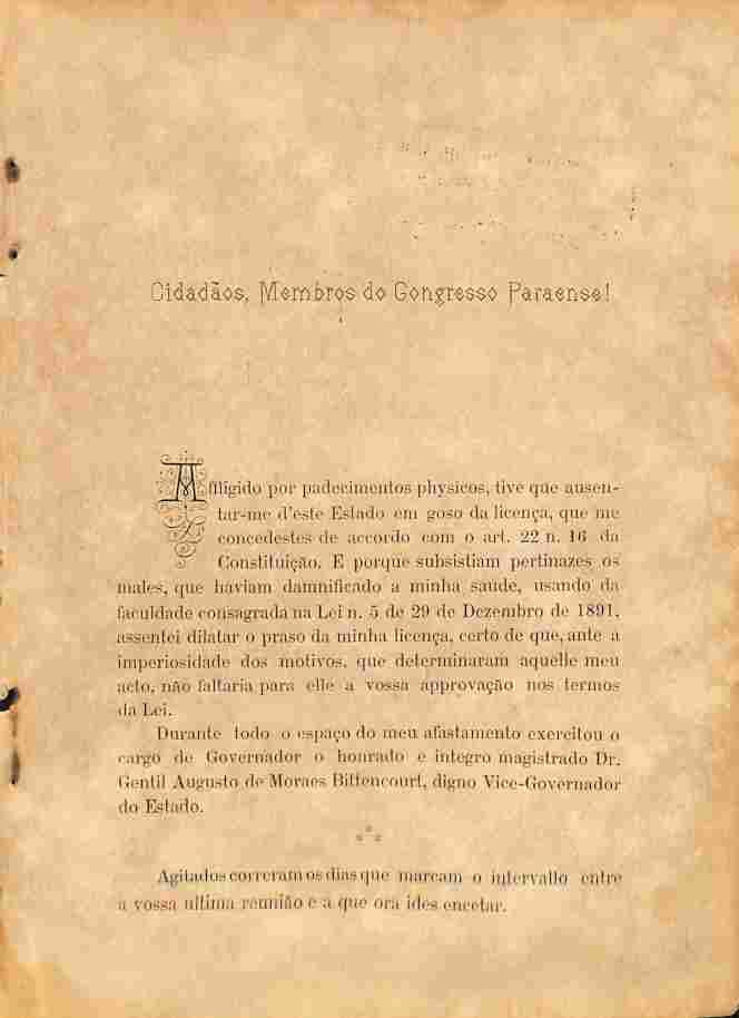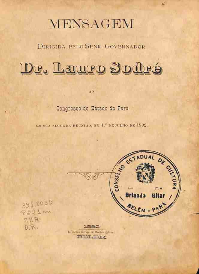 Mensagem dirigida ao Senr. Governador Dr. Lauro Sodré : ao Congresso do Estado do Pará em sua segunda segunda reunião em 1º de julho de 1892
